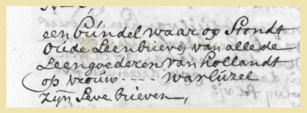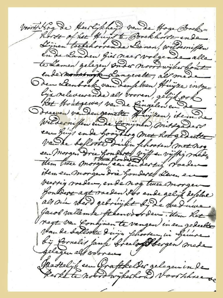 – Ende nog in twee stukken teelland als voren genaamt de hooge warinckhorst ofte varinckkasse ende hebbende laatstelijk nog een achterleen groot drie mogen land leggende in de ban van noordwijk gelegen tussen de warande van de boekhorst en die hoge duinen, die dezelfde warande belegen heeft aan het oosteinde, te verheerwaden met een stoop Rijnse wijn of vier schellingen Hollands, volgens het laatste leenboek van 4 maart 1713 voor de stadhouder van den huize te boekhorst en leenmanner voor het laatst verleijd op Cornelis Jacobszoon van der Speck