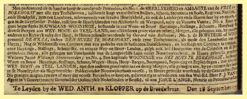 – Bestaande hetzelve in de heerlijkheid van de vrije en laage boekhorst gelegen in de zwijlander polder tussen de heerlijkhen van Alkemade en Warmond en de Vrouwevenne hebbende de heer als vanouds het recht van aanstelling van baljuw, schout, schepenen, secretaris stadhouder leenmannen, griffier van de lenen welke aanstonds door den koper kunnen worden aangesteld en de bode mitsgaders het recht van naasting, tienden en hondgeld. Ende voornoemde landerijen in een partij houtland groot of verongelden voor 100 RR genaamd het Galgenveld en in een hoeve of boerenwoning met dezelve erven, huizing en ap- en depentien alsmede de daar bij behorende omtrent 18 morgen land, verhuurd aan Jan Schakenbos ten opzigte van de landerijen tot kersmis 1783 en ten opzichte van de woning en huizing tot mei 1784 voor 300 gulden per jaar, doende in de ordinaire verpondingen 87 gulden 7 stuivers en 4 penningen, mitsgaders in nog een partij weiland groot of verongelden voor 800 RR verhuurd tot kersmis 1783 aan Jan Schakenbos voor 28 gulden