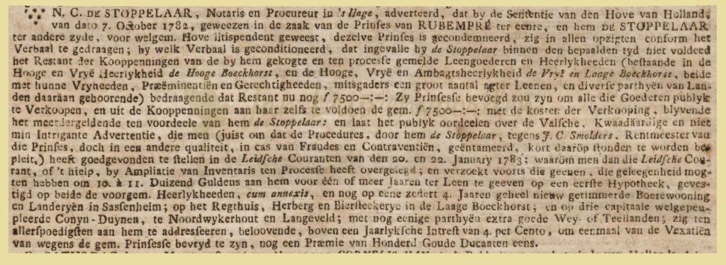 Nicolaas de Stoppelaar moet furieus geweest zijn en in dit geval niet onterecht. De Hoge Raad had hem immers nog 6 maanden gegeven na oktober 1782 om tot betaling van de 7.500 gulden uit het “vredespijpakkoord” van 1779 over te gaan. Hij wint de zaak tegen de heer Smolders over deze vroegtijdige aankondinging van de verkoop en genoemde details, die immers schadelijk voor zijn reputatie zijn. Smolders krijgt een boete en wordt voorwaardelijk verbannen uit Holland voor zes jaar. In een krantenadvertentie reageert De Stoppelaar in niet mis te verstane bewoordingen. Hij maakt duidelijk dat ook de prinses de Rubempré zich heeft te houden aan gemaakte afspraken en sluit af met de zin “dat de krantenlezer zelf mag …oordeelen over de valschheid en kwaadaardigheid der onnutte en niets ter zaake doende advertentie, door zeeker practicijn van J.C. Smolders doen stellen in de Leidsche Courant van den 20e en 22e januari 1783…”
