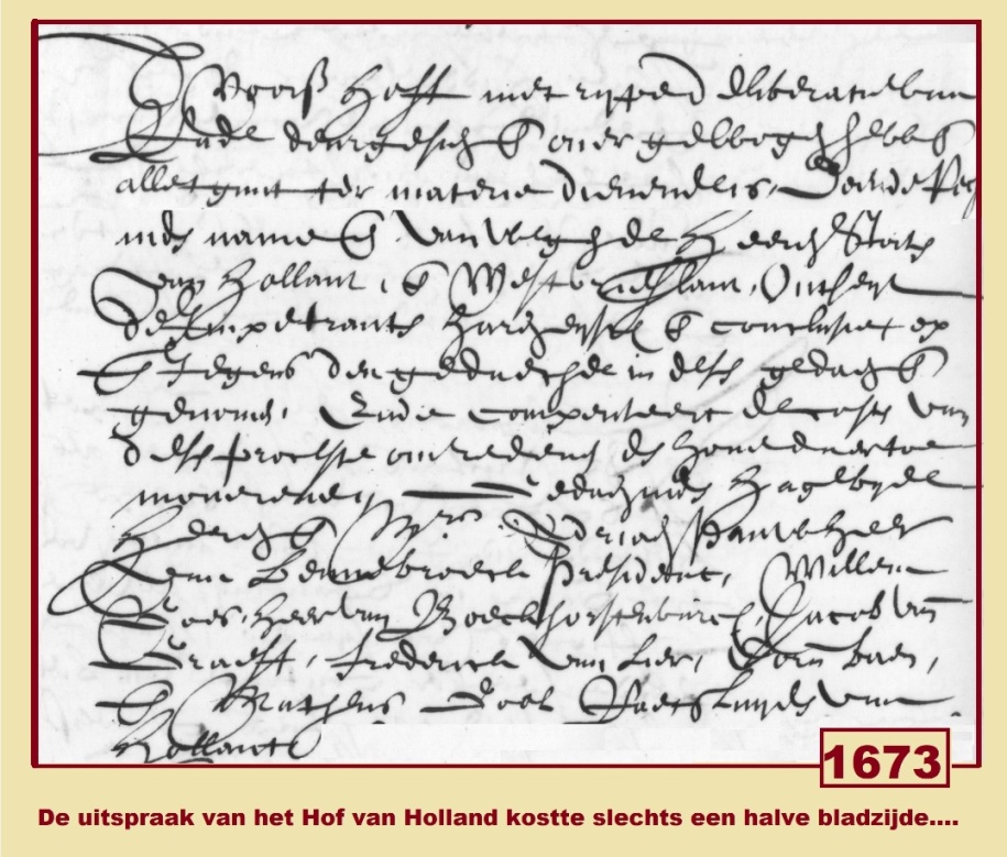 Om de processen bij het Hof van Holland te kunnen volgen is vaardigheid in het lezen van de oude teksten nodig. Dat geldt in de eerste plaats voor het technisch lezen van de oude handschriften waarvan de schrijvers niet allemaal cum laude geslaagd waren voor het diploma schoonschrijven! Maar ook het verklaren van woorden of juridische begrippen die wij in onze tijd niet meer kennen maakt het lezen lastig. Het doorgronden van de complexe kwesties die voor de rechters van het Hof gebracht werden vergt dan ook ervaring, veel vallen en opstaan. Waarbij het vooral belangrijk is om de relatie tussen de verschillende namen die genoemd worden goed in kaart te brengen. Kortom: wie is wie, wat is zijn of haar rol? In dit geval praten we over een proces dat pas 63 jaar na het betwisten van een achterstallige betaling tot een definitieve uitspraak komt, er zijn vier generaties mee gemoeid!