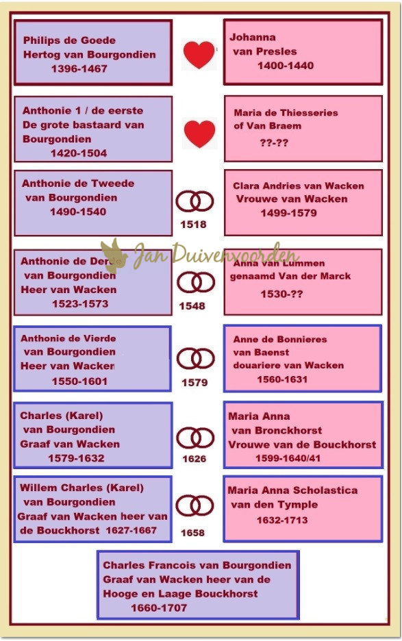 Toen Willem van Bronckhorst en zijn vrouw Maria van Warlusel kort na elkaar overleden in Gent lieten zij in 1636 twee dochters na. Adriana Françoise en Maria Anna van Bronckhorst. Adriana is nooit getrouwd, maar Maria Anna was bij de dood van haar ouders al zo’n tien jaar echtgenote van Charles (Karel) van Bourgondiën, graaf van Wakken (Wacque/Wacke). En onder zijn voorouders vinden we één van de meest klinkende namen uit de Europese geschiedenis, namelijk die van Philips van Bourgondiën, beter bekend als Philips de Goede (1396-1467). Daarmee is de geschiedenis van het kleine onbeduidende kasteel in Noordwijkerhout verbonden met de man die volgens historici een belangrijke rol heeft gespeeld in de eenwording van West-Europa. Maar belangrijkheid is relatief en zeker deze familierelatie want Philips was als zovele van de machtige heersers uit de Middeleeuwen een notoire vreemdganger. In zijn geval praten we over een man die meerdere keren getrouwd is geweest maar ook achttien kinderen erkend heeft uit de buitenechtelijke relaties die hij onderhield met maar liefst dertig maîtresses! Uit de stamboom hieronder blijkt dat ook de tweede generatie, zoon Anthonie de grote bastaard van Bourgondiën, de liefde buiten het huwelijk zocht. In het overzicht is het buitenechtelijk gedrag van deze eerste twee generaties aangegeven met een hartje. Laten we met dit symbooltje maar aannemen dat er sprake was van liefde bij het verwekken van kinderen. Voor alle buiten het huwelijk geborenen werd overigens door deze familie een goede partner of maatschappelijke positie gezocht en men had in die tijd ook geen enkele moeite om openlijk te spreken over hen als zijnde “bastaards”.