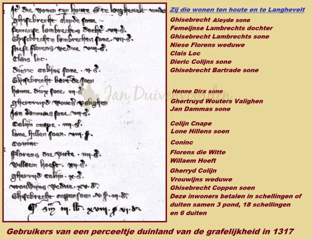 Waar mensen zich organiseren ontstaat belasting en waar belasting geheven wordt ontstaat administratie die vervolgens bewaard wordt in archieven. De oudst gevonden vermeldingen van het Duinschoten betreffen dan ook betaalde pachten, belasting en zogenaamde tiendrechten. Met in de hoofdrol de rentmeesters van het grafelijk gezag en de abdij van Egmond. We kunnen zelfs verder terug in de tijd dan de mogelijkheden die het archief van het klooster Leeuwenhorst ons zo vaak biedt, want dat begint als het gaat om de gewone burger of boer pas vanaf circa 1400. Hier starten we met een lijstje van inwoners die “in den houte’ en het Langeveld wonen, opgenomen in de eerste jaarrekening van de rentmeester van de graaffelijkheids rekeningen over het boekjaar 1316/17. Zij duiken als het ware op uit de mist situatie die de Middeleeuwen vormen als het gaat om de niet bemiddelde burger. In de eeuwen ervoor wordt de gewone man zelden genoemd.