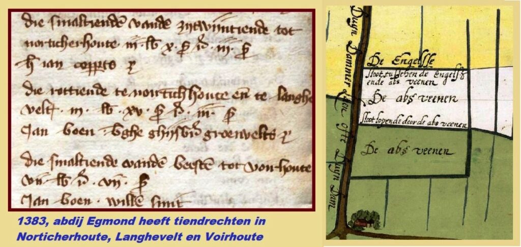 Voor percelen grond of gebieden hebben we wat meer houvast en kunnen we zelfs terug naar de dertiende eeuw en eerder. Het Langeveld is een zeer oude naam, maar dat geldt ook voor het Absveen, dat we kennen als straatnaam in de wijk Zeeburg. Een naam die onder andere al in 1248 genoemd wordt en verwijst naar schenking van grond aan een abt van het klooster in Egmond. De kerken van Voorhout, Sassenheim en Noordwijk vielen organisatorisch onder dat klooster. De abt had onder meer de bevoegdheid de pastoors voor deze dorpen te benoemen. In Noordwijkerhout stond weliswaar een kerkgebouw (“capel”) maar in de dertiende eeuw was de dienende pastoor mogelijk nog verbonden aan de kerk in Noordwijk. Het klooster in Egmond was belangrijk of beter gezegd: machtig. In de Bollenstreek was men net als de kloosters Leeuwenhorst en Rijnsburg eigenaar van percelen grond maar Egmond bezat ook vele tiendrechten. Dat betrof het recht op tien procent van de oogstwaarde van alle percelen in nauwkeurig omschreven gebieden, dus ook van percelen waar het klooster zelf geen eigenaar van was. In 1248 schenkt rooms-koning Willem het klooster vele tienden in de Bollenstreek. Het zijn novale tienden, wat zou inhouden dat deze tienden nieuw gevestigd waren op gebieden die kort daarvoor aan de natuur onttrokken waren. Bekend voorbeeld betreft de Alkemadese Tienden. Dat betrof het tiendrecht op percelen land tussen het huidige Westeinde, de Schulpweg en de Duinsloot in Noordwijkerhout. Andere voorbeeld zijn de Molentienden tussen Westeinde en Kerkstraat. De Duintienden, Zuidwijntienden en de Rottienden van Egmond lagen in het Langeveld, waaronder in het Duinschoten.