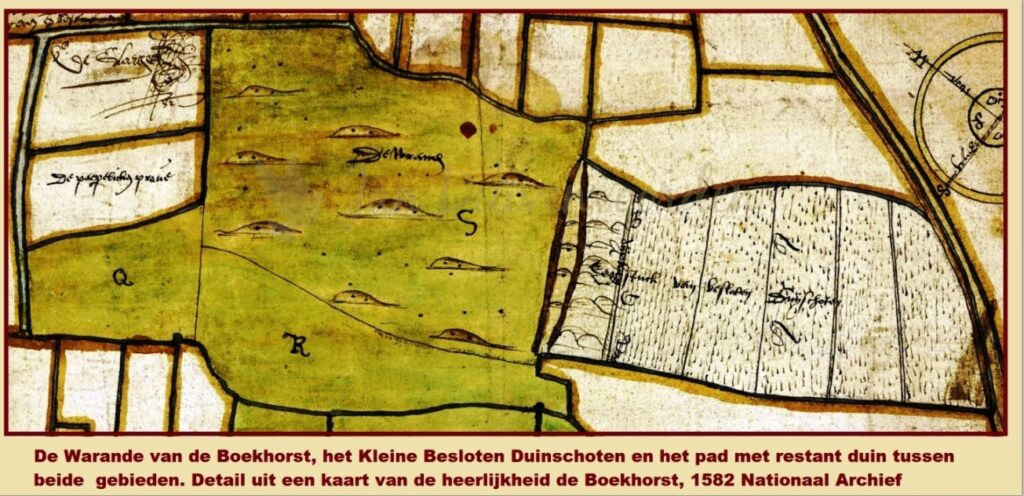 Op een kaart uit 1582 van de Heerlijkheid de Boekhorst zijn de Boekhorster Warande of Wra en het Besloten Duijnschoten fraai terug te zien. De ingekleurde Boekhorstpercelen zijn met een letter weergegeven. Q en R zijn weilanden, S is de Warande, ook wel Wra of Wraa genoemd. Aan de zuidzijde van het jachtterrein wordt de “Paepeliche Prove” genoemd. Het Kleine Besloten Duijnschoten ten zuiden van de Langevelderweg wordt hier “Een stuck van” Besloten Duinschoten genoemd. De kaart geeft ons een waardevolle momentopname want het laat zien dat dit gebied dat in de 16e eeuw nog bebost was in het jaar van het opmaken van deze kaart al grotendeels is omgezet naar akkers in rechte percelen. Behalve een klein stukje aan de Warandezijde, daar worden nog duintopjes ingetekend en twee dijkjes, die gebruikt werden om perceelgrenzen aan te geven. Hier liep het pad dat vervolgens via het grote perceel ten westen (boven) van het Duinschoten aansloot op de Langevelderweg. Vijf jaar later wordt de eerder beschreven kaart voor de duinpachtverhuur gemaakt. Daar heeft het pad een vaste vorm gekregen. Het pad lag er dus al dik vijftig jaar voor de processen gevoerd werden en zal al die tijd gebruikt zijn.