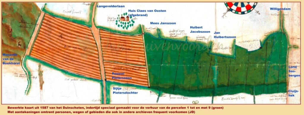 In het groene gedeelte op de kaart vinden we de negen verpachte percelen uit de openbare veiling van duinpacht in 1588 met enkele namen van pachters, allemaal bewoners van het Langeveld. De kaart is met zekerheid ten behoeve van de verpachting van dat jaar gemaakt en voor komende periodes. Rechts de Willigendam, in feite het verlengde van de Cluijslaan. Die laan voerde vanaf de Herenweg door het Stelduin naar de Cluijs, een jachtterrein dat ook bekend staat als de Cattenhorst (zie elders op deze website). Hier werd in de vijftiende eeuw nog gejaagd op valken. Bij de auditie waarover eerder gesproken is wordt het Cluijshek genoemd dat het Duinschoten afsloot aan de noordoostzijde maar ook is er sprake van een Cattendijck. Dat zou het dijkgedeelte bij de Cattenhorst kunnen zijn, maar is ook de naam van een familie die in die periode wordt genoemd. Niet uitgesloten is dat naam van de dijk en familie samenhangen. Tenslotte is rechts nog het land van Sasbergen (Zasberg) genoemd. In 1587 woonde IJsbrant Pieterszoon “van Sasbergen” op deze oude boerenhoeve. Ook hij was een broer van erflaatster Sijtje Pietersdochter. Maar tijdens de Troubelen pachtte hij de boerderij van het huis Ter Does in Leiderdorp, zie elders op deze website.