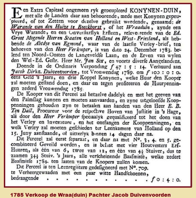 Verkoopbrochure. In 1785 wordt de heerlijkheid de Hooge Boekhorst met bijbehorende weilanden en jachtterrein te koop aangeboden. Perceel twee, de Warande van den Huize te Boeckhorst of Wraduin wordt aangeprezen als een rijk bevolkt konijnenduin, maar lag dus pal naast de akkers van Duijnschoten, waar de boer liever geen konijnen zag verschijnen.