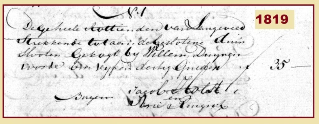 Uit hetzelfde jaar waarin de kaart gemaakt is dateert een akte waarin de curatoren van de universiteit Leiden en de burgemeesters van die stad nog eens laten vastleggen dat zij recht hebben op de opbrengst van de rottienden van het Langeveld. Zij richten hun brief aan de Hoge Raad. Het geclaimde recht was op naam van de universiteit gesteld na de Annotatie van de goederen van het klooster Egmond. Letterlijk staat er in moderne spelling: “…dat onder jurisdictie van Noordwijk gelegen is een lang groot blok, genaamde de gehele rottienden tot Langeveld en is in het zelfde blok begrepen een lang deel van omtrent 60 morgen (50 ha) duinachtig land, genaamd de Besloten Duijnschoten…..en alzo de voornoemde universiteit gerechtigd is tot het koren-, raapvlas- ,hennep- en smaltienden van alle tienden onder de jurisdictie van Noordwijk, zo heeft dezelfde universiteit van de tijd af dat de Besloten Duinschoten tot korenland gemaakt is in de laatste zes, zeven, acht en meer jaren, de tienden van het gewas van de Besloten Duinschoten verkocht of verpacht…”.