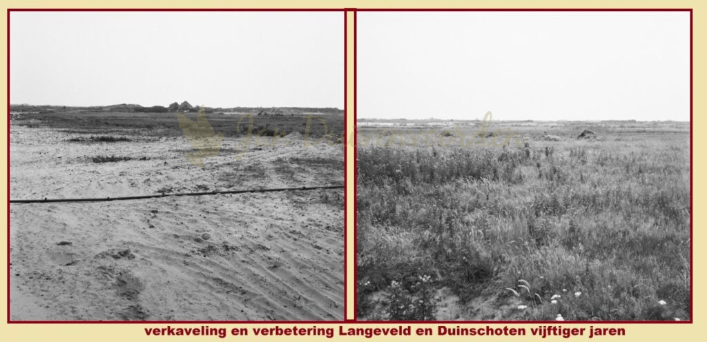 Met de komst van het psychiatrisch ziekenhuis kreeg het Langeveld een flinke economische impuls, elders had het opkomend toerisme al een zelfde effect gehad. Maar agrarisch is het gebied ten noorden van de Langevelderweg ook toe aan verbetering. Het ondergaat een grote verandering wanneer het door de Heidemaatschappij letterlijk op de schop wordt genomen. Men zoekt daarbij een oplossing voor de flinke hoogteverschillen en verschillende ondergrondlagen in het gebied. Tussen zeeduin en de binnenduinen bevonden zich stroken veengrond. Het ooit zo lege, stille gebied van het Duinschoten en Langeveld is tegenwoordig onherkenbaar. Gelukkig hebben we de foto’s nog….