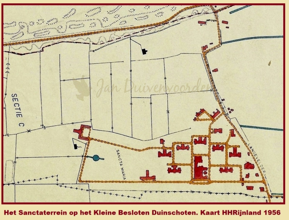 1956. Kaart Hoogheemraadschap Rijnland. De gebouwen van Sancta Maria met aan de achterzijde de boerderij op percelen van de Boekhorster Wra.