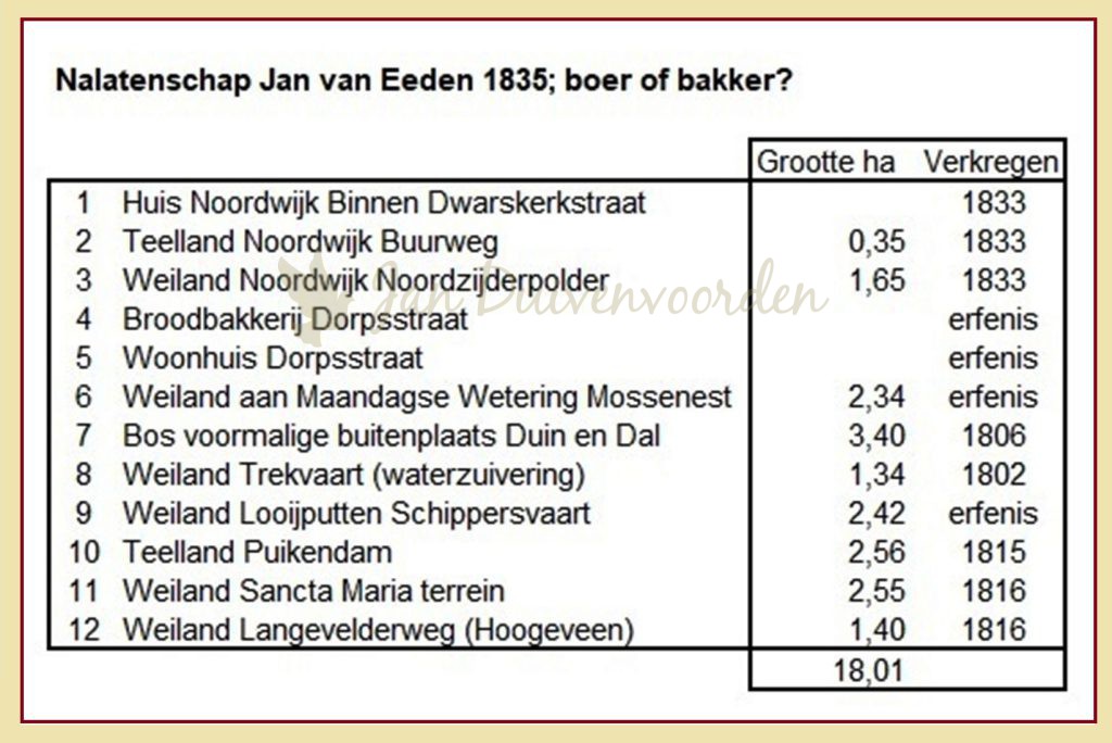 Jan van Eeden was oorspronkelijk schipper en marktkoopman maar na de dood van zijn schoonouders neemt hij met Sijmentje in 1804 hun bakkerij aan de Dorpsstraat over en vestigt daarin ook een winkeltje. Het handelsbloed blijft in Jans aderen kriebelen want hij investeert in de jaren erna in de aan- en verkoop van onroerend goed. En het echtpaar profiteert kort voor hun dood van nagelaten Noordwijks bezit. Uit de eigen nalatenschap blijkt dat het bakkersechtpaar maar liefst 18 hectare aan weilanden bezit in de omgeving, wat het de vraag opwerpt of Jan misschien liever boer dan bakker was. Maar meerdere inkomstenbronnen waren in het verleden heel normaal.