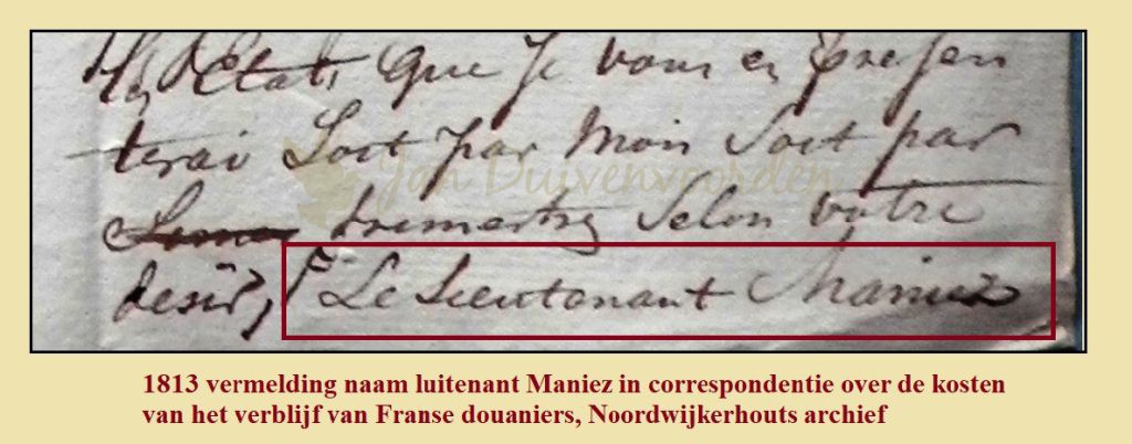 Een bijzonder document uit het Noordwijkerhouts archief  biedt in dit geval de oplossing. Informatie over de Franse aanwezigheid in onze regio is zeldzaam en namen van Franse soldaten zijn nauwelijks te vinden. In een korte correspondentie tussen de burgemeester van Noordwijkerhout en een Franse administratief “directeur” over vergoeding van de kosten van het verblijf van Franse douaniers duikt de naam van luitenant Maniez op. De Fransen stationeerden de keizerlijke douane vanaf 1810 in het land om met name de smokkelarij in verboden Engelse producten tegen te gaan. Pierre Maniez is commandant van een brigade die kort in het dorp onderdak heeft gehad vanaf eind 1811, de oudste datum binnen de genoemde correspondentie. De precieze verblijfsduur is onduidelijk en valt ook niet af te leiden uit de vergoeding die burgmeester Koudijs in april 1813 ontvangt, 380 franse frank (zie boven dit verhaal).