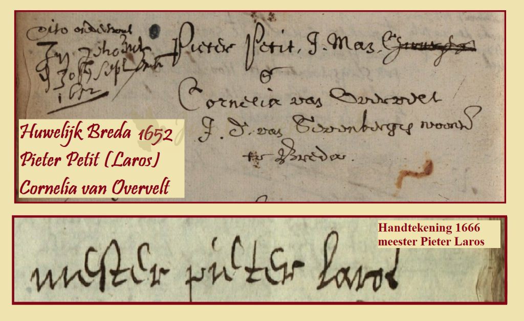 De naam La Roche komt in 1599 al voor in Breda. De eerste twee Pieter Petit’s of Pieter La Roche waren chirurgijn, de familie is gereformeerd. Stamvader Pieter Petit zou rond 1600 in Breda geboren zijn en is medio 1625 getrouwd. Uit zijn huwelijk met Sara van den Brouck kennen we enkele kinderen, waaronder zoon Pieter, die als chirurgijn onder andere voor het leger werkte onder kapitein Van Beveren. Deze Pieter kreeg na zijn huwelijk in 1652 met Cornelia van Overvelt uit Zevenbergen maar liefst 14 kinderen, waarvan meerderen jong gestorven zijn. Zijn zoon Pieter, geboren op 10 oktober 1654 verhuisde als volwassene naar Noordwijk waar hij trouwde met de Katwijkse Marijtje van der Bijl in 1681.