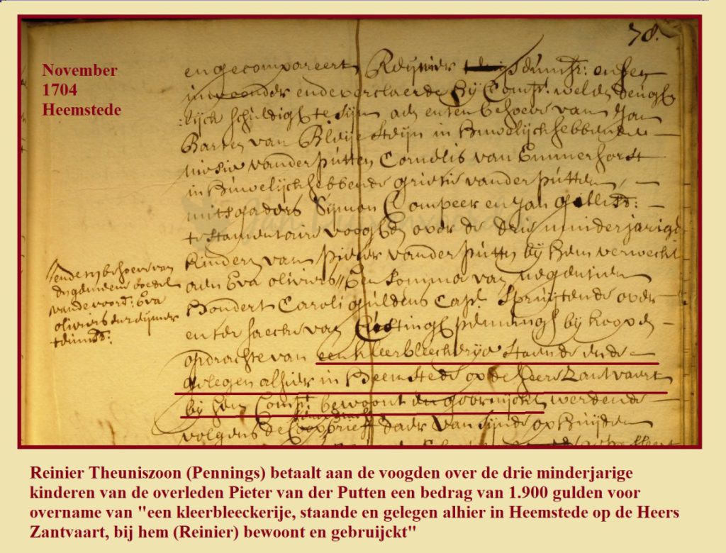 Reinier Theuniszoon Pennings is de stamvader van de Bollenstreekfamilie Pennings. Hij trouwde in 1701 in Berkenrode met IJffie (Eva) Oliviersdochter de Lange uit Heemstede. Zij was weduwe van Pieter Pieterszoon van de Putten, met wie zij in 1680 getrouwd was en met wie zij ook vijf kinderen had, waarvan twee overleden waren. Reinier, zelf in het jaar 1674 geboren, was dus een stuk jonger dan zijn echtgenote en kreeg als 27-jarige via dit huwelijk direct drie bonuskinderen. Maar hij werd ook eigenaar van de klerenblekerij van zijn schoonfamilie aan de Herenzandvaart in Heemstede. Daarvoor moet hij eerst een regeling treffen met de voogden van de kinderen van zijn overleden vrouw IJffie uit haar eerste huwelijk. Daaronder valt ook de overname van een schuld die zij samen met haar overleden man had bij Huibertje Hendriksdochter Heemskerk. Daarmee hebben we de eerste relatie tussen de familie Pennings en de Noordwijkerhoutse Heemskerkfamilie te pakken, want Huibertje is geboren op het Huis Ter Lugt, dezelfde boerderij aan de Delfweg die later eigendom zal worden van Hein Pennings.