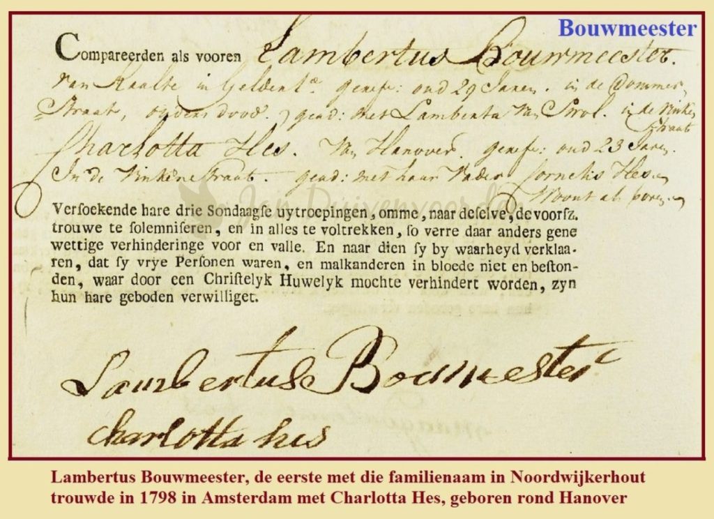 Enkele jaren terug is voor het stamboomboek van Bert Hogervorst over de familie Bouwmeester uitgebreid gezocht in het archief van Oost-Nederland en dan met name Aalten. In dat dorp wordt in 1768 Johannes Lambertus Bouwmeester (Boumeister/Boumeester) geboren, later vaak alleen Lambertus als voornaam dragend. Zijn moeder was niet getrouwd en omdat we de vader niet kennen werd de achternaam van de moeder aangehouden. Zij blijkt een kleindochter van Jan Bouwmeester die zijn achternaam dankt aan de boerderij waar hij begin 18e eeuw op woonde. In die regio was het overnemen van de naam van de woonplek een gewoon verschijnsel en dat blijkt ook uit de naam van de voorouders van Jan want die woonden enige tijd op een oud kloosterterrein en werden om die reden “Van het Klooster” genoemd.