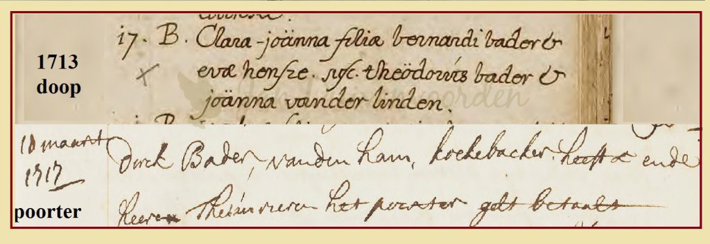 Theodorus/Dirk Bader wordt in 1717 als poorter van Amsterdam ingeschreven, een soort verblijfsvergunning. Om als inwoner/poorter geaccepteerd te worden was een vast beroep en een borg nodig. Dirk wordt koekenbakker genoemd, net als zijn broer Johannes Bernardus, die daarnaast ook in tabak handelde. Dirk was vier jaar voor het poorterschap al getuige bij de doop van één van de kinderen van zijn broer. Die had sinds zijn huwelijk in 1706 al enkele kinderen gekregen waarbij geen leden van de familie Bader als doopgetuigen genoemd worden. Dat is een sterke aanwijzing dat Dirk Bader en ook zijn zus Elisabeth kort voor 1713 naar Amsterdam gekomen zijn om net als hun broer in deze stad in het gewest Holland een toekomst op te bouwen. De familie is katholiek en maakt gebruik van de kerk of parochie met de wat aparte naam “Stadhuis van Hoorn”.