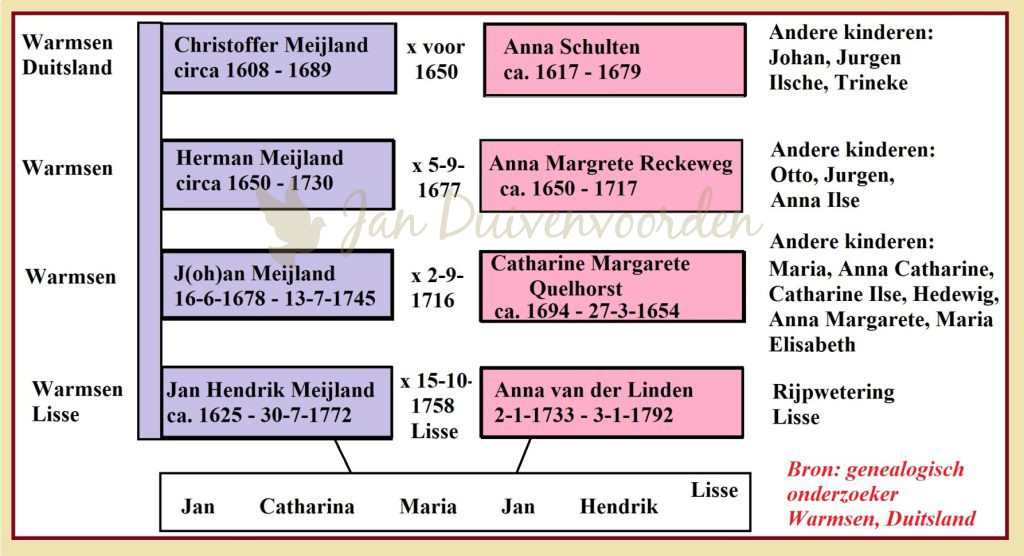 Omdat de geboorteplaats van de vroeg overleden (1771) Jan Meijland bekend is kunnen we met grote zekerheid vaststellen wie zijn voorouders waren. Er wonen namelijk bijzonder weinig mensen met die achternaam in Warmsen en die zijn in de 18e eeuw aan elkaar verwant. Het is dus genealogisch vissen met een groot net in een kleine vijver. De Duitse genealoog laat zien hoe het eigendom van de woning van de familie Meijland is doorgegeven binnen de generaties. Opvallend detail is dat bij de naam van Johannes Hendrick Meijland wordt vermeld dat hij (als enige zoon) afstand heeft gedaan van de “hof”, hetgeen past bij iemand die naar ons land verhuisd is. Zijn zus wordt eigenaresse. Dat gekoppeld aan het feit dat Jan een dochter de naam Catharina geeft en daarmee zijn moeder vernoemt, is een sterke aanwijzing dat we de juiste voorouders te pakken hebben. En dat geeft het volgende schema van de eerste generaties Meiland.