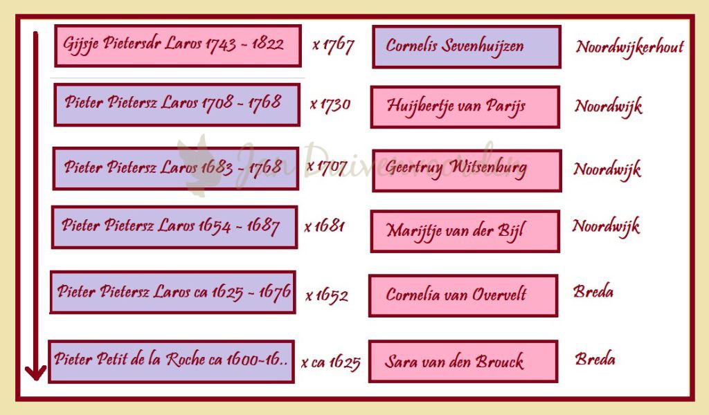 Gijsje Pietersdochter Laros uit Noordwijk trouwde in 1767 met Cornelis Sevenhuijzen en woonde tegenover de Witte Kerk waar zij na het overlijden van haar man in 1802 nog twintig jaar lang een winkeltje gehad heeft. Haar familienaam was van oorsprong “(De) La Roche”. De familie zou volgens stamboomonderzoekers oorspronkelijk uit Bretagne afkomstig zijn maar woont begin 17e eeuw in Breda. De vijf gevonden voorvaders van Gijsje hadden allen als voornaam Pieter. Maar hun achternamen zijn bij de eerste generaties divers. Zij worden naast “De La Roche, La Roche, Larosse en Laros” ook opgeschreven bij dopen of huwelijken als “Pieter Petit of Pieter Petyt”. Aan de namen van hun echtgenoten kunnen we vaststellen dat het wel degelijk om dezelfde familie Laros moet gaan.