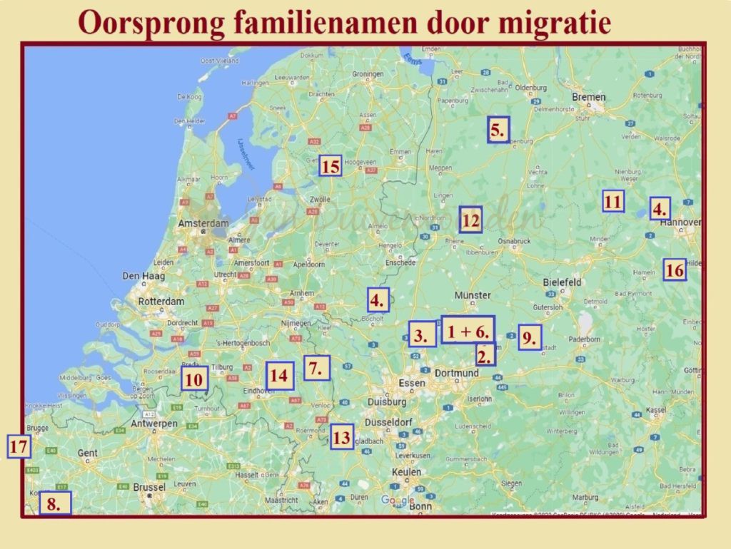 Tijdens de eerste dag van de Noordwijkerhoutse geschiedenis in oktober 2022 stonden stambomen centraal. Het thema “Van wie ben je er één?” lokte vele mensen naar de Witte Kerk. Vooral de bijnamen als typerend Noordwijkerhouts erfgoed vielen in de smaak. In de voorbereiding op die dag is gekeken naar de herkomst van bekende familienamen. Dat leverde een aardig lijstje namen op van voorouders die ooit de beslissing namen hun vertrouwde omgeving te verlaten en een toekomst op grote afstand van hun naasten op te bouwen. De mannelijke migranten namen de familienaam mee.