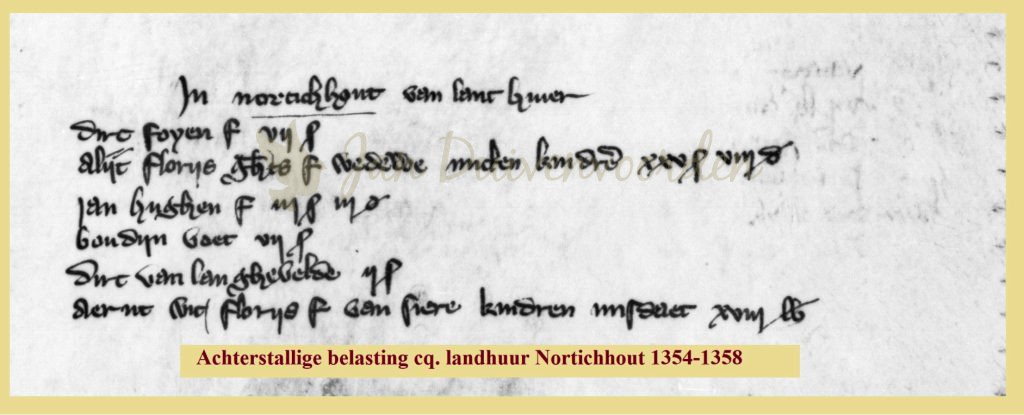 Het erfhuuroverzicht dat aan de jaarrekening van 1358 van rekenmeester Philips van Tetrode van de Grafelijkheids Rekenkamer is toegevoegd laat ons 78 betalers zien, zowel mannen als vrouwen. De laatsten vaak als weduwen. De Noertick(er)houters – de dorpsnaam kent vele schrijfwijzen – betaalden hun erfhuur in ponden, schellingen, denieren, obolen en mijten, oude munteenheden. Dat er 78 unieke namen genoemd worden is een indicatie van het totale aantal inwoners. Tussen 1600 en 1800 lag dat aantal stabiel op zes- tot zevenhonderd en circa 115 woningen of boerderijen, inclusief De Zilk. Met de nodige voorzichtigheid komen we dan omgerekend voor 1358 of midden 14e eeuw uit op 400 tot 450 inwoners voor het dorp Noerticherhout. Uit de late 15e eeuw weten we dat het aantal inwoners nog wat gekrompen is om na 1600 weer te stijgen.