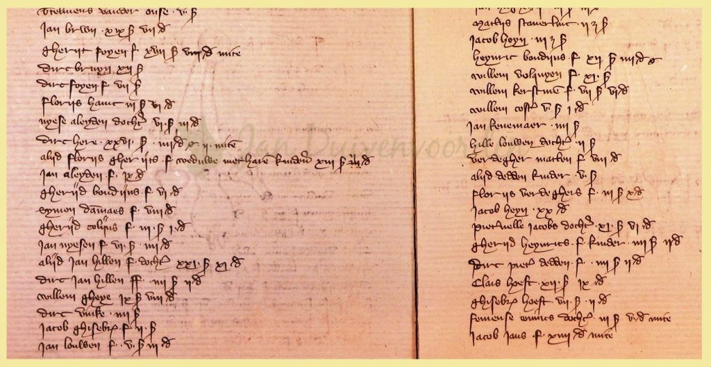 Er worden enkele weduwen genoemd zoals Alijd, de weduwe van Florijs Gerytszoon en Beatrijs Borst met haar kinderen. Niesje en Ermgart zijn hoogstwaarschijnlijk beide dochters van Ghisken Bruyensdochter maar betalen separaat huur voor gebruik van een erf, maar dat sluit niet uit dat zij in hetzelfde huis woonden. De voornamen Jan, Willem en Dirk klinken alledaags maar Femeijnse, Nyese, Ghisbrecht, Verdigher en Alijd zijn dat zeker niet meer.