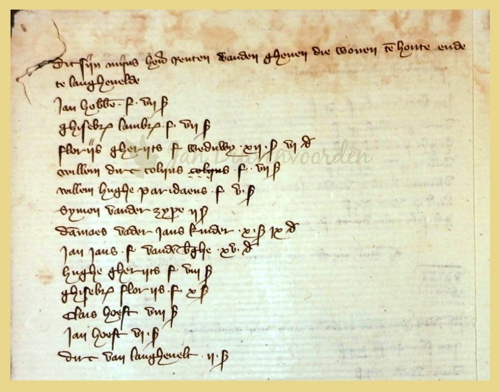 De bijlage van rekenmeester van Philips van Tetrode vermeldt ook de inwoners van het Langeveld. Omdat de koptekst luidt: “…van degene die wonen te houte en te langeveld” moeten we hier waarschijnlijk naast de woningen rond de kapel ook de huizen toe rekenen die in het bosrijke deel van het Langeveld woonden, waar nog veel “hout” stond in de 14e eeuw. Het lijstje bevat 13 Langeveldse hoofdbewoners.