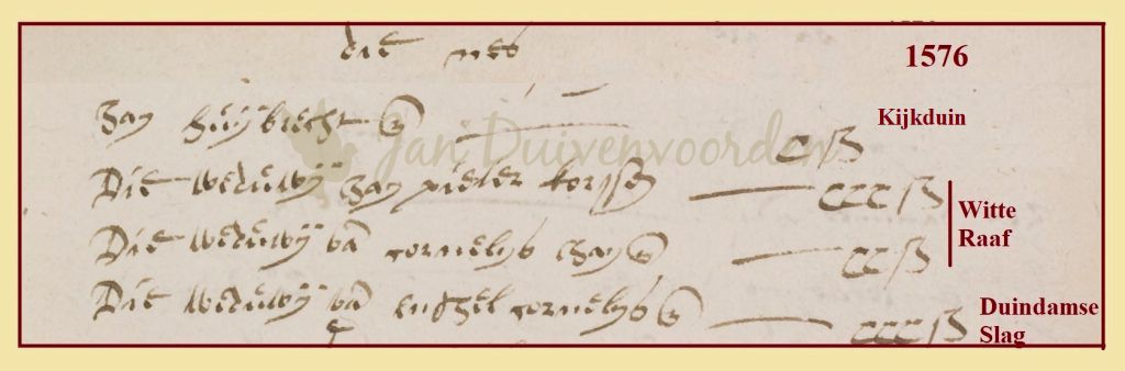 Tot nu hebben we bewoners van de boerenlocatie de Witte Raaf behandeld die in een ouder, waarschijnlijk nog houten gebouw hebben gewoond dan de boerderij die onderzoeker inschatte op een bouwdatum rond 1630. Uit de tekst van het Willig Decreet van 1588 valt niet op te maken wat de status van het boerengebouw was dat door Pieter Willem Stevenszoon werd verkocht aan jonkheer Guido van Meetkercke De tekst luidt: “…zekere woning met de aanklevinge van dien, als huis, schuren, bargen, geboomte, potinge en plantinge, aard- en nagelvast, met omtrent zes morgen en vijf en een half hond land, luttel min of meer, zoals die gelegen waren aan voorschreven woning, leggende aan Duijndam in de ambacht van Noordwijk…”. Daar kunnen we niet zoveel mee als het gaat om de vorm en ouderdom van het gebouw. Niettemin zijn er aanwijzingen om het geschatte bouwjaar 1630 van Uilkema bij te stellen, de Witte Raaf blijkt ouder, maar ouder dan 1588, het jaar van de overdracht aan Van Meetkercke ligt niet voor de hand. Daar zijn twee belangrijke aanwijzingen voor.