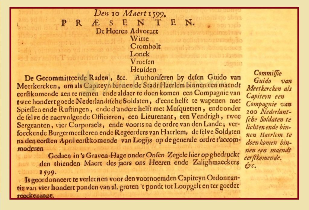 Terwijl zijn oom als verrader verbannen werd, werd Guido van Meetkercke juist zeer gewaardeerd in Holland. De scheidslijn tussen wie als vriend of vijand werden beschouwd is zowel emotioneel als rationeel, uiterst dun en bepalend voor het eerste deel van de 80-jarige oorlog. Voor zijn vertrek met de Hollandse vloot in 1599 kreeg Guido van de Staten van Holland nog de opdracht om als kapitein binnen de stad Haarlem een compagnie soldaten te vormen ter verdediging van de stad. Kort daarna moet hij ingescheept zijn op de vloot. De datum van zijn dood levert een aardige puzzel op. Het archief van het klooster Leeuwenhorst geeft ons het jaar 1600 als overlijdensjaar, in ieder geval voor november. Uit november dateert een brief van raadspensionaris Johan van Oldenbarnevelt aan de heren van de Ridderschap Holland, de eigenaren van het klooster, om toekenning van een “prove” aan de dochter van Guido van Meetkercke. De proven waren uitkeringen aan nonnen en adellijke dochters, gefinancierd uit de opbrengsten van de kloosters Leeuwenhorst en Rijnsburg. Toekenning verliep volgens een procedure waarbij de adellijke families binnen de Ridderschap om toerbeurt een jongedochter konden voordragen voor een uitkering. Van Oldenbarnevelt was naast raadspensionaris van Holland ook pensionaris of advocaat van de Ridderschap. Hij excuseert zich voor zijn inbreuk op de procedure maar zou de bijzondere prestaties van de overleden militair Guido van Meetkercke graag postuum beloond zien met een uitkering aan zijn dochter, waarvan de moeder Van Wijck tot een oud adellijk geslacht zou hebben behoord, een andere procedurele eis.