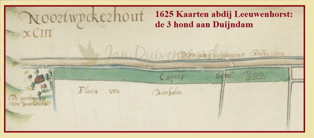 Dankzij de pachtersoverzichten van het klooster Leeuwenhorst aan de Leeweg in Noordwijkerhout kunnen we de bewoners van menige boerderijlocatie goed in beeld brengen. Dat is wel onder de kanttekening dat tweede bronnen nodig zijn om met zekerheid te kunnen zeggen of er ook een woning op die locatie stond. De rentmeestersrekeningen van het klooster vermelden eigenlijk alleen de namen van pachters en de periode waarin zij land huurden of een lening sloten met hun bezit als onderpand. Slechts in een enkel geval worden gebouwen vermeld. Zeer nuttig zijn de details over familierelaties die zo nu en dan door rentmeesters worden vermeld. In het geval van de boerderijen langs het zeeduin vormt het uitgebreide en oude archief van het dorp Noordwijk de gewenste tweede bron. Daarin zijn de nodige lijsten van belastingbetalers te vinden vanaf het einde van de 15e eeuw. Hun namen staan meestal op geografische volgorde, men volgde als het ware op papier een route langs de deuren van de belastingplichtigen. Ook hiervoor geldt dat elk detail bij een naam waardevol is, met name de vermelding van het eigenaarschap van een woning. Maar bijvoorbeeld ook dat de eigenaar overleden is en zijn weduwe de woning op naam heeft gekregen of haar erfgenamen. De combinatie van klooster- en dorpsarchieven levert het volgende lijstje met bewoners voor het jaar 1600. Bij elk een korte aantekening.