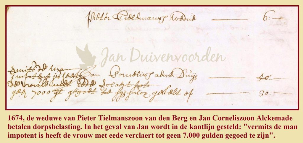 Jan Corneliszoon aen Duijn is in zijn laatste levensjaren dement geworden. Dat kunnen we afleiden uit een overzicht uit 1674 waarin zijn weduwe de belasting betaalt en haar man “impotent” genoemd wordt. Er zijn meerdere woorden die gebruikt worden voor mensen die handelingsonbekwaam zijn, naast impotent wordt vaak “innocent” of “buiten zijn zinnen” gebruikt om de geestestoestand aan te duiden. In 1679 spreekt het Leeuwenhorstarchief over de verhuur van 300 roe land aan Duindam aan de weduwe van Jan Corneliszoon, een jaar eerder was dat nog Jan zelf. We mogen daar voorzichtig uit afleiden dat Jan voor 1679 gestorven is. Nauwkeuriger is een aanwijzing uit het testament van zijn zoon Cornelis van 26 februari 1676. Daarin benoemt hij alleen zijn moeder tot erfgenaam, Cornelis wil als enig erfgenaam van zijn vaders nalatenschap zijn verkregen beschermen door zijn laatste wil vast te leggen. Jan Corneliszoon is dus kort voor het opmaken van dat testament overleden, we houden hier 1675 als overlijdensjaar aan.