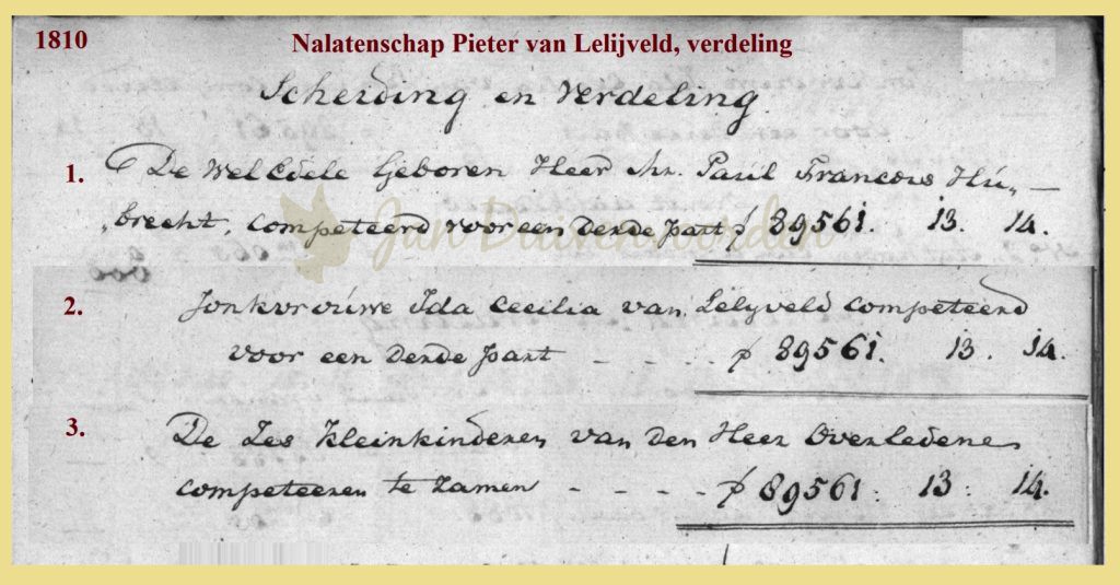De broer van Paulus, Pieter van Lelijveld die in april 1809 overlijdt heeft uit zijn eerste huwelijk een zoon Pieter, maar die sterft een jaar voor zijn vader, zijn kleinkinderen worden in zijn plaats erfgenaam. Daarnaast heeft hij uit een tweede huwelijk twee dochters, Ida en Maria. De laatste trouwde de jurist en notaris Paul Francois Hubrecht. Hij zal een belangrijke rol gaan spelen in de exploitatie van de kalkbranderijen binnen de familie. Tragisch is dat Maria als erfgenaam van haar vader slechts een maand na hem overlijdt, zij sterft in mei 1809. Haar echtgenoot Paul Hubrecht en zijn twee kinderen Francesca en Pieter Glaudius worden in haar plaats voor een derde deel erfgenaam. Zijn schoonzus Ida van Lelijveld ontvangt een derde deel en het laatste derde part is ook hier voor kleinkinderen, in dit geval van de kinderen van de zoon Pieter van Lelijveld die een jaar voor zijn vader overleed en getrouwd was met Cypriana Anna van Royen. Hij had met haar zes kinderen, die allen van hun opa erven. En er valt ook wat te erven! De totale nalatenschap van Pieter van Lelijveld bedraagt in 1810 bijna 270.000 gulden. Een zeer groot deel daarvan bestaat uit obligaties en leningen. Als zijn broer Paulus een vergelijkbaar vermogen had praten we dus over een half miljoen gulden, grotendeels verdiend met de kalkbranderij. De rijkdom van de kalkbrandersfamilie staat in fel contrast met het sobere bestaan van hun schelpenleveranciers. Daar zijn de nodige voorbeelden van te vinden en zeker onder Noordwijkerhoutse families.