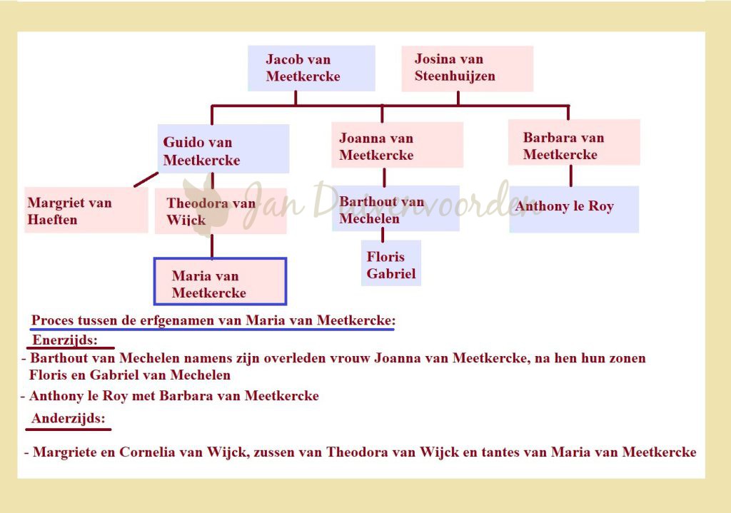 Een nieuwe nalatenschapswet die kort daarvoor van kracht was geworden in het gewest Holland maar niet geldend was daarbuiten leidt tot flinke discussie. Twee partijen komen tegenover elkaar te staan. Enerzijds zijn dat zussen van Maria’s moeder, Theodora van Wijck, de eerste echtgenote van Guido van Meetkercke. Anderzijds zijn het de kinderen van Maria’s tante Joanna van Meetkercke die met Barthout van Mechelen getrouwd was. Maar ook Guido’s zuster Barbara van Meetkercke claimt een deel van de erfenis. Tantes, neven en nichten van Maria vechten in meerjarige processen om de verdeling van de nalatenschap, het levert fraaie inzichten op over de wijze waarop adellijke of rijke families erfenissen betwisten.