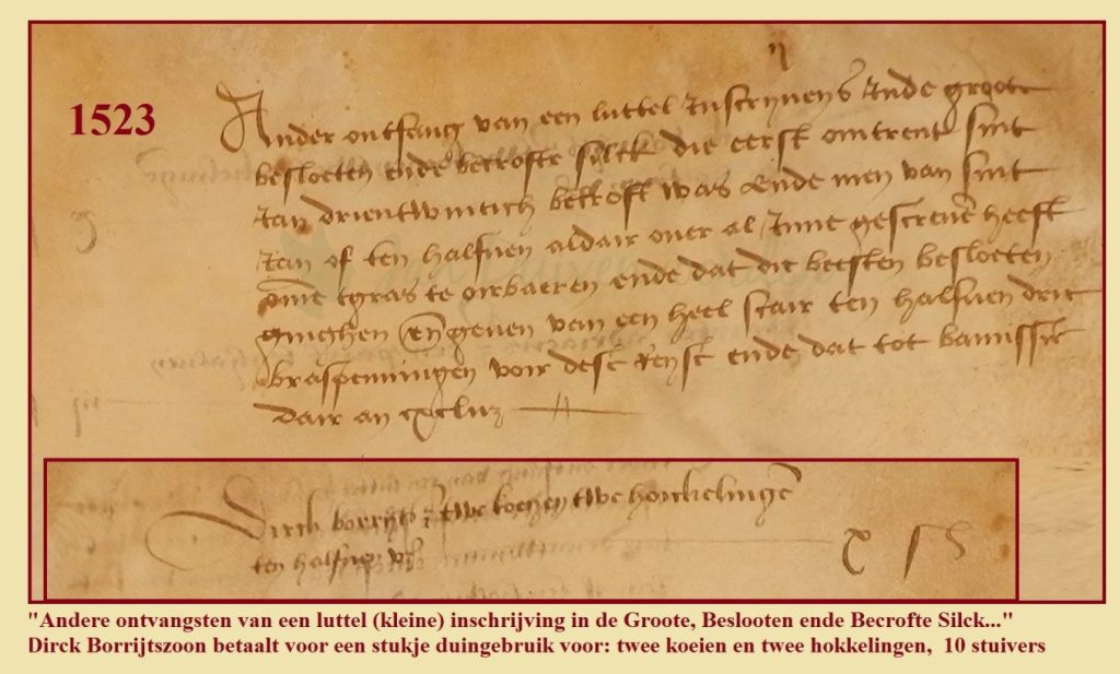 In ouder bronmateriaal dan de Tiende Penning van 1543 en het Morgenboek van hetzelfde jaar vind je meestal geen namen van gewone burgers of boeren. Maar omdat in Noordwijkerhout en De Zilk veel binnenduin lag dat eigendom was van de Graven van Holland tref je onder de vroegste duinpachters wel meer een Zilker of Noordwijkerhouter aan. We vonden in de rentmeestersrekening van het jaar 1523 al Dirck Borritszoon maar er is nog een tweede mazzeltje. Uit twee andere rekeningen, van 1529 en 1533, blijkt dat in die jaren een “Claes Dirck Borritszoon” in De Zilk woont. Dat levert een tweede mogelijkheid heb voor de verwantschap tussen Dirck Claeszoon en eerste bewoner Dirck Borritszoon, de laatste zou zijn opa kunnen zijn. Dirck is dus een zoon van Claes Janszoon of een zoon van Claes Dirckszoon maar in beide gevallen is hij familie van Dirck Borritszoon en zijn vrouw Alijd.