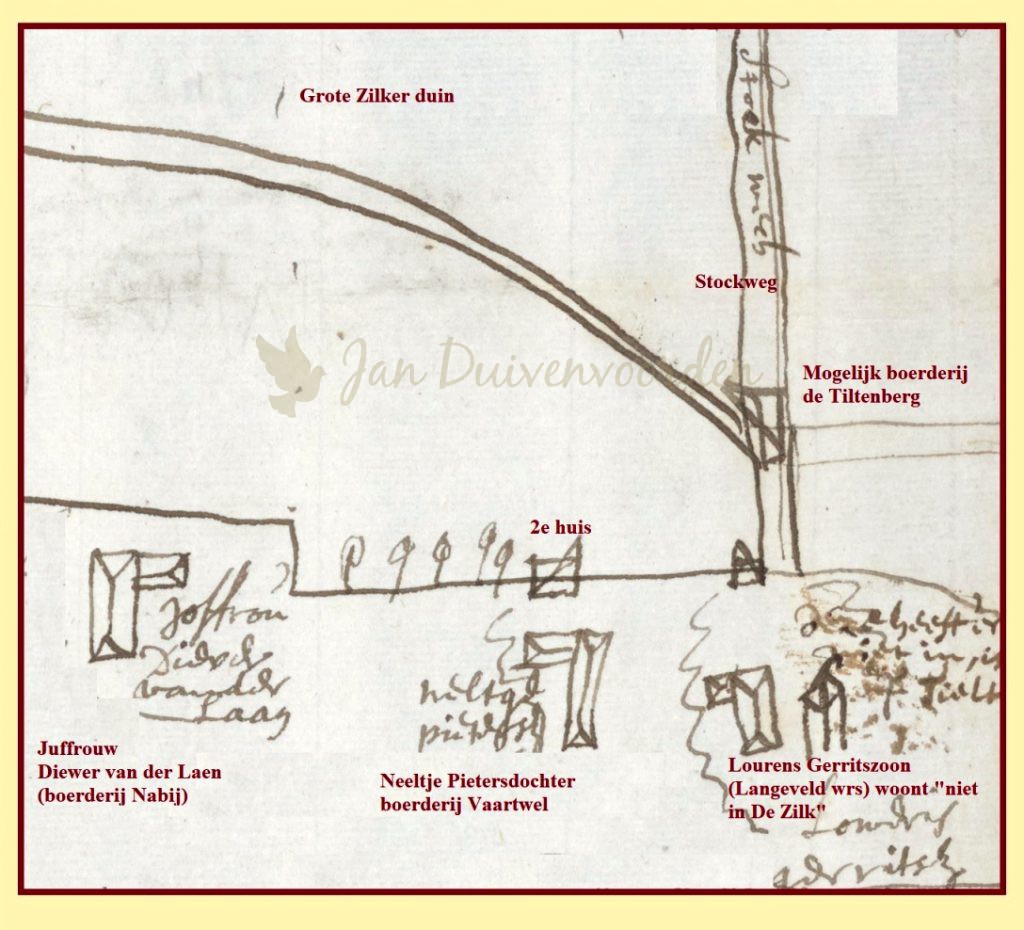 Aan de noordoostzijde van het Grote Zilker duin vinden we de grens in de vorm van de Stockweg. Linksonder boerderij Nabij van eigenaresse Diewer van der Laen, daarnaast Vaartwel van weduwe Neeltje Pietersdochter en vervolgens de boerderij van Louris Gerritszoon Langevelt, die volgens het kaartje net over de grens staat. Tegenover Vaartwel lijkt nog een huisje ingetekend. Vermoedelijk is dat de woning van Beatris en Jan Gerritszoon. De grond die de familie Oudaen gebruikte ligt zowel in De Zilk als in de Vogelenzang, zodat we hen ook tegenkomen in akten die in dat dorp zijn opgemaakt.
