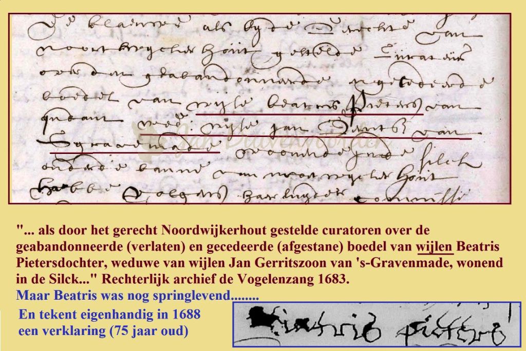 Het jaar daarop wordt Beatris Oudaen door het dorpsbestuur van Noordwijkerhout onder curatele gesteld en zullen curatoren haar boedel moeten verkopen. Opmerkelijk genoeg is het het leven van Beatris volgens het ambachtsbestuur van de Vogelenzang geeindigd want in april wordt de “geabandonneerde” (verlaten) boedel van “wijlen Beatris Pietersdochter” voor ruim 4.300 gulden verkocht. Die boedel bestaat dan in de Vogelenzang uit een perceel van negen morgen land rond het Kijfduin, nabij de Stockweg. Maar Beatris was zeker nog niet overleden, dat gebeurt pas jaren later. Een kwalijk foutje van de ambachtsbestuurders. In 1688 tekent zij springlevend, 75 jaar oud en daarom met enigszins bibberende hand een verklaring bij de notaris. Gelukkig wisten de bestuurders in Hillegom beter want daar wordt uit de boedel voor 2.800 gulden nog een groot perceel van 10 morgen (9 ha) verkocht en is er geen sprake van een “wijlen” Beatris.