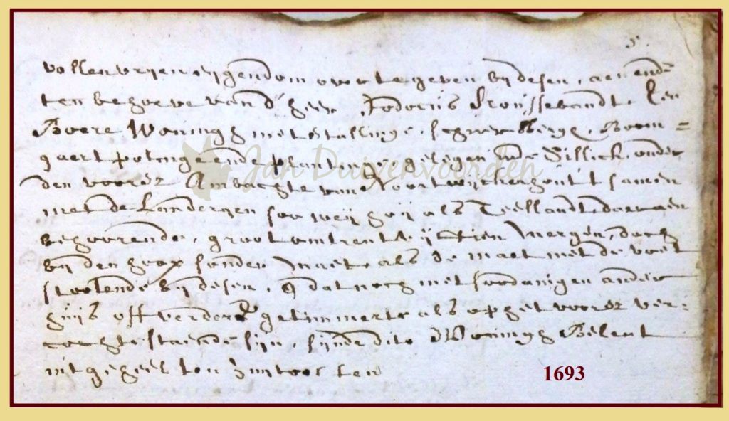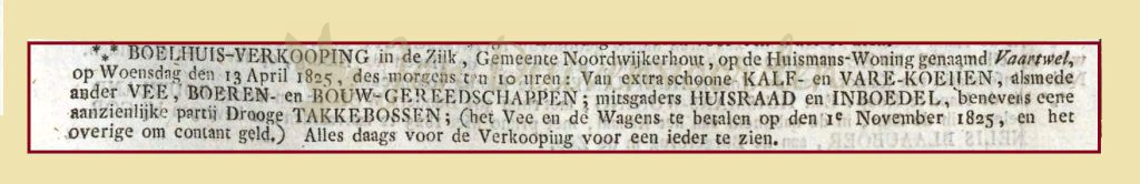 “…in volle eigendom over te geven bij deze aan en ten behoeve van de heer Jodocus Koussebant, een boerenwoning met stal, schuur, hooibergen en boomgaard, geboomte en beplanting, gelegen in de Sillick onder het ambacht Noordwijkerhout. Samen met de wei-, hooi- en teellanden tot de boerderij behorend groot omstreeks 15 morgen. En dat nog met verdere huis of getimmerte op het verkochte staande…”