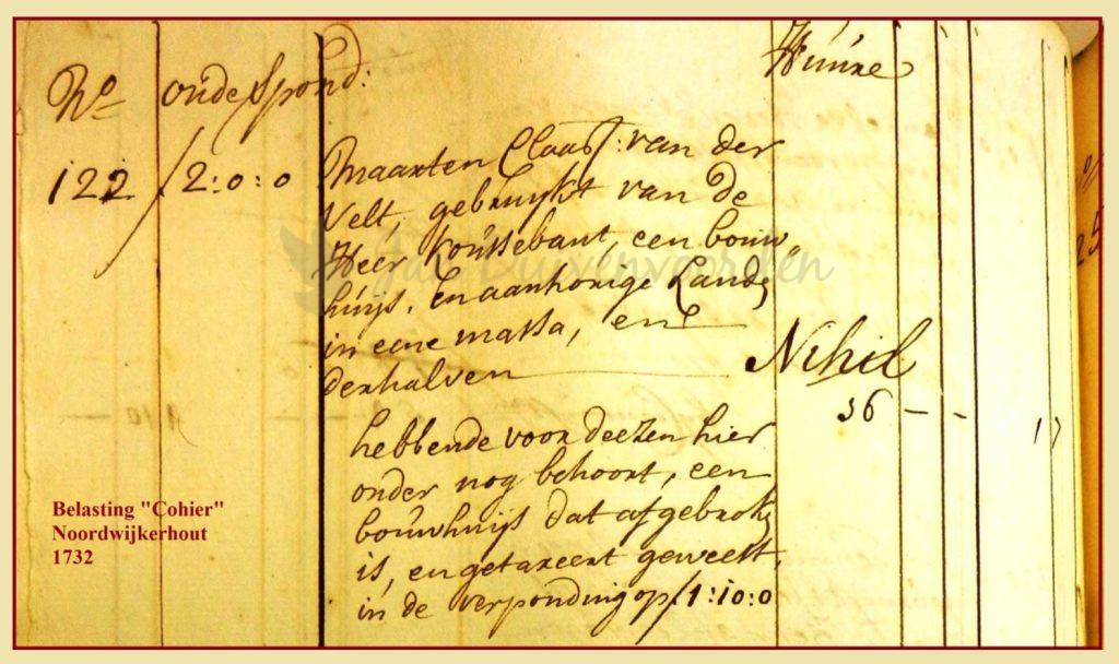 Vlak voor de verkoop vinden we nog een interessant detail in de belastingregisters van Noordwijkerhout van 1732. Maarten Claeszoon van der Velt is nog altijd pachter van de woning van de heer Cousebant, dan al zo’n twaalf jaar. Een tweede huisje op de locatie is volgens het register afgebroken. Op de Vaartwel-locatie stond volgens de omschrijvingen nog maar één woning, tot de boerderij werd vijftien morgen aan landerijen gerekend, een tweede huisje wordt nergens genoemd. De aantekening in het belastingregister kan verwijzen naar het tweede huis van de familie Oudaen maar dat zou al eerder afgebroken zijn. Andere optie is een arbeiderswoning tussen de weilanden, in 1690 toebedacht aan de Haarlemse dokter van Marijtje Pietersdochter, zoals elders in dit verhaal toegelicht.
