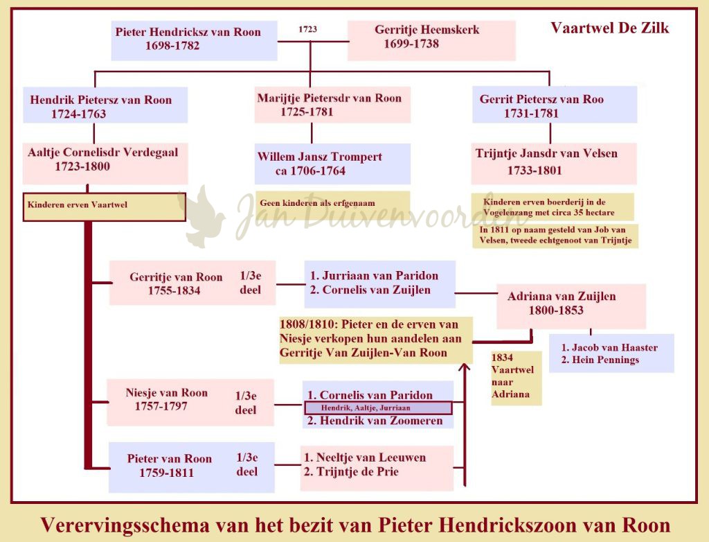 Niesje was in eerste huwelijk getrouwd met Cornelis van Paridon. Zij krijgt met hem drie kinderen: Hendrik, Aaltje en Jurriaan. In januari 1797 wil zij opnieuw trouwen, met Hendrik van Zoomeren. Zij maken huwelijksvoorwaarden op en moeten daar eigenlijk ook een lijst van ingebrachte goederen aan koppelen maar dat verzuimen zij. Drie maanden later overlijdt Niesje, het kersverse echtpaar wist nog net een week daarvoor een testament op te maken. Hendrik maakt geen punt van de erfenis, alle ingebrachte bezittingen van Niesje worden eigendom van de drie kinderen uit haar eerste huwelijk. De voogden van deze kinderen besluiten samen met Pieter Pieterszoon van Roon om gezamenlijk hun 2/3e deel in het bezit van boerderij Vaartwel en landerijen aan Gerritje Pietersdochter van Roon over te dragen. En omdat Gerritje uit haar twee huwelijken met Jurriaan van Pardion en Cornelis van Zuijlen slechts één erfgenaam heeft komt Vaartwel in 1834 uiteindelijk in handen van haar dochter Adriana van Zuijlen.