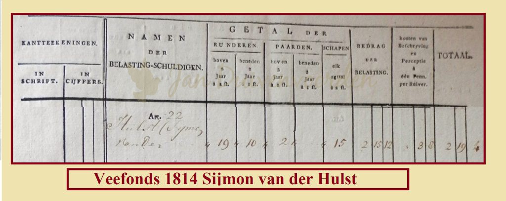 Een indruk van de omvang van het boerenbedrijf van Sijmon en Grietje van der Hulst kunnen we vinden in het Veefonds van 1812-1814. Het werd opgericht om geld te verzamelen ter bestrijding van de veepest die nog altijd de boerenstand zwaar kon treffen. Sijmon molk in 1814 negentien melkkoeien, had 10 stuks jongvee in de wei staan en gebruikte twee paarden op zijn bedrijf. Daarnaast liepen er ook nog 15 schapen rond. Ter vergelijk de cijfers voor heel Noordwijkerhout: 833 melkkoeien, 453 jongvee, 115 paarden en 689 schapen.