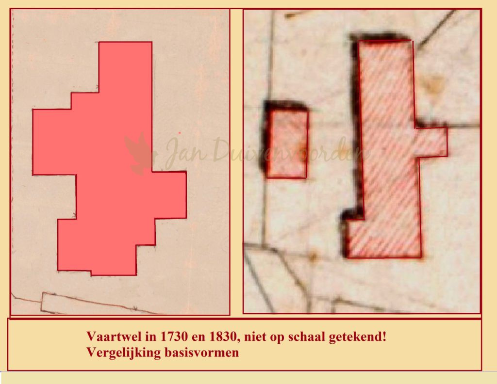 Het huis lijkt echter niet of nauwelijks op de huidige Vaartwelwoning. Een vergelijking van de schets en een kadastertekening uit 1832 laat dat mooi zien. De schets van de familie Six is daarbij van strakkere lijnen voorzien en ingekleurd, het kadaster tekende voor ons de vorm van de Vaartwelwoning uit de 19e eeuw. De getekende schaal is onbekend, dat maakt vergelijken iets lastiger. Maar voorlopig is de conclusie dat het huidige Vaartwel-gebouw weinig of geen overeenkomsten met het gebouw uit 1730 vertoont en dus na dat jaar gebouwd zal zijn.