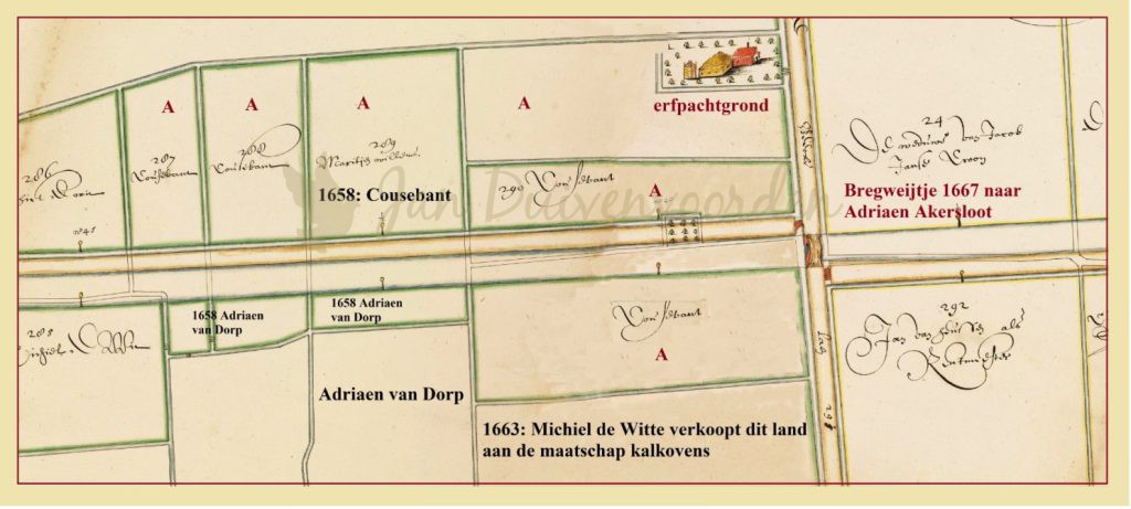 In 1684 volgt die koop waarbij kalkbrander Adriaen Corneliszoon Akersloot het aan de vaart grenzende perceel van de Cousebantfamilie kan verwerven. Voor vierduizend gulden wordt Adriaen eigenaar van alle percelen die met de letter A zijn weergegeven op de kaart. Bij elkaar zou dit ruim zes morgen of vijf en een halve hectare groot geweest zijn. Een flink deel van dit land is terug te voeren naar begin 16e eeuw, naar de families Van Foreest en Van Hoorn, voorouders van Adriana van Hulft, de echtgenote van Frans Barendszoon Cousebant.