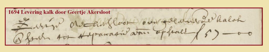 Een jaar later geeft Claes Adriaenszoon Akersloot per notariële akte volledige volmacht en zeggenschap aan zijn zus Geertje bij het beheer van hun kalkovenbezit, dus ook de mogelijkheid om gezamenlijk bezit eventueel te verkopen. Een bijzondere akte, want in de regel kwam het niet vaak voor dat vrouwen een dergelijke handelingsbevoegdheid werd toegekend. Broer en zus zullen een goede relatie hebben gehad. Claes woonde aan de kalkovens, Geertje in Haarlem aan de Eerste Nieuwe Gracht, waar zij de stenen- en kalkhandel draaiende hield na het overlijden van haar ouders. Helaas komt aan deze samenwerking een einde want Geertje is kort voor februari 1700 overleden. Claes is haar erfgenaam en daarmee enig overgebleven eigenaar van de kalkbranderij aan de Leidse Trekvaart. Het is een behoorlijk bezit voor deze alleenstaande man, die zelf geen kinderen heeft om de kalkovens aan over te dragen. Dat hij ook nu weer bij de notaris een zwager volledige volmacht geeft in zakelijke kwesties te handelen doet vermoeden dat hij geestelijke of lichamelijke zwakte kende. In een later document zien we dat bevestigd want er is dan sprake van een “lichamelijke quelling” waar Claes onder gebukt ging.