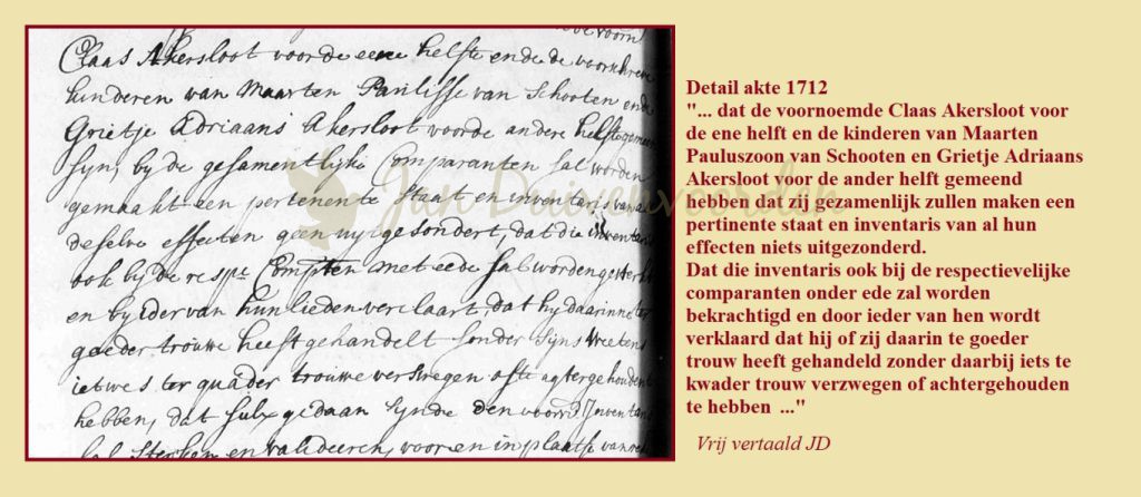 De dood van Maarten en Grietje van Schoten-Akersloot, drie weken na elkaar en het overlijden van Neeltje Akersloot kort voor dit tweetal heeft tot gevolg dat de kinderloze weduwnaar Dammis Meerhouck op 18 mei 1705 uit de maatschap stapt via een onderhandse regeling. En dat was dus het onderwerp van gesprek met de voogden van de weeskinderen die in september van dat jaar definitief bij de notaris werd geregeld. Maar zonder ook maar de maatschap te noemen in de akte. Lekker verwarrend voor onderzoekers.