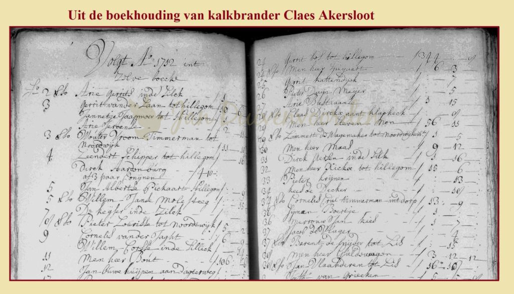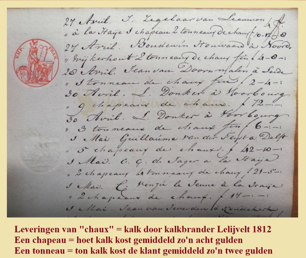 Om een idee te krijgen van de verkoop van kalk hieronder een detail uit het verkoopboek van de de firma Lelijvelt uit 1812. De verkoopadministratie is in het Frans opgesteld, we praten dan ook over het laatste jaar van het Koninkrijk Holland, dat onder Franse leiding stond. De kalk wordt verkocht per hoet of per ton. Gemiddeld kost een hoet kalk zo’n 8 gld, een ton een kwart daarvan. Op de derde regel een Noordwijkerhoutse klant, timmerman Boudewijn Houwaard. Bij de firma Lelijvelt leverde elke kalkoven 10 tot 12 keer per jaar een hoeveelheid kalk, in een omvang die afhankelijk was van de grootte van de oven. Uit de kaart van de ovens van Cornelis Soutman weten we dat hij twee grote en twee kleine ovens in productie had.