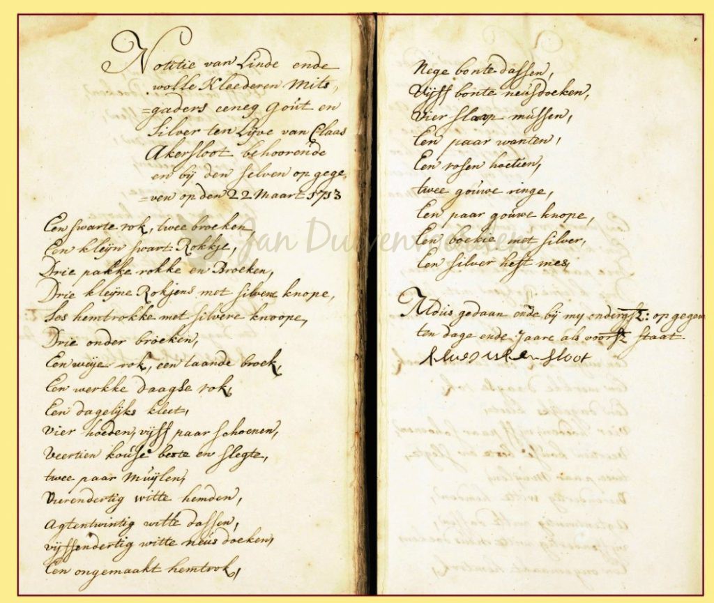 De verdeling van de boedel van de maatschap wordt bij notaris Mens in Hillegom vastgelegd maar ook in het Rechterlijk Archief van dat dorp. Daartoe behoort ook een overzicht van de persoonlijke kleding van Claes Akersloot, Frans Boon en zijn vrouw Marijtje, Paulus van Schoten en de nog minderjarige Magdalena en Adriaen van Schoten. Het is toch wel bijzonder om driehonderd jaar na dato te kunnen lezen hoeveel onderbroeken iemand in de kast had liggen. En in vergelijk met zijn neven en nichten lijkt de kleding kast van Claes behoorlijk bescheiden te zijn geweest. “14 kousen, goede en slegte, een ongemaakt hemdrok en 35 witte neusdoeken”, geven niet bepaald de indruk en uitstraling van een rijke kalkbrander!