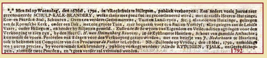 Dat de kalkbranderij als investering gezien wordt door de laatste eigenaren blijkt uit de verkoop van een derde van de helft dus een zesde deel in het eigendom van het complex aan Amsterdammer Johannes Molier. Die verkoopt dat zesde deel twee jaar later aan de voormalige schout van Lisse, Lutsenburg. En vervolgens zien we ook nog een lening voorbijschuiven van Spijk de Laurier, die geld leent bij zijn compagnons met zijn helft in de kalkbranderij als onderpand. Of dit alles de bedrijfsvoering ten goede kwam is maar de vraag. Feit is dat in 1792 het gehele complex op een openbare veiling wordt aangeboden. De advertentie uit de krant is het enige bewijs dat we hebben van de veiling, want de aankoop en overdracht is niet te vinden op de gebruikelijke plaats, het Rechterlijk Archief van Hillegom.