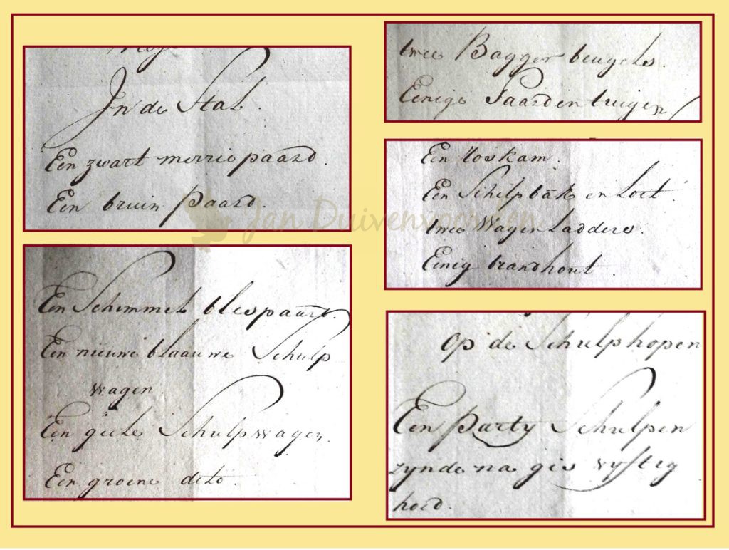 | Een beste wagen, een chaise, een oude schulpwagen, een gierbak, met lood beslagen wielen, twee karrewagens, twee kruiwagens, turf, hout, spek, vlees, haver, slijpsteen, boter in de kelder, plus een wit paard en drie koeien | 503 |
