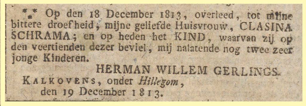 In 1803 trouwt de 36-jarige Herman Willem Gerlings met de 11 jaar jongere Claasje Cornelisdochter Schrama. Een opvallende keuze want in vergelijking met de rest van zijn familie kwam zijn levenspartner uit een tamelijk eenvoudig milieu. Zij is dochter van Cornelis Schrama en Marijtje Pietersdochter Langeveld. Het huwelijk duurt slechts tien jaar want Claasje overlijdt in 1813 in het kraambed, samen met haar kindje. Herman blijft achter met twee jonge kinderen.