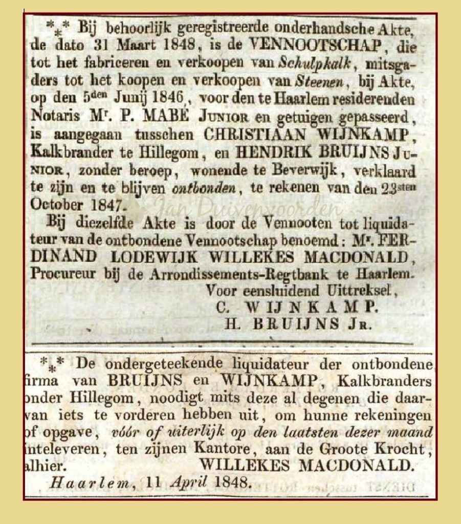 Bij elkaar houdt Herman Hermanszoon Gerlings na afbetaling van zijn schuld nog zo’n tienduizend gulden over. Kort daarop starten twee compagnons de kalkbranderij weer op. Het is echter van korte duur, want de vennootschap van de Hillegommers Hendrik Bruijns en Christiaan Wijnkamp houdt binnen twee jaar op te bestaan.