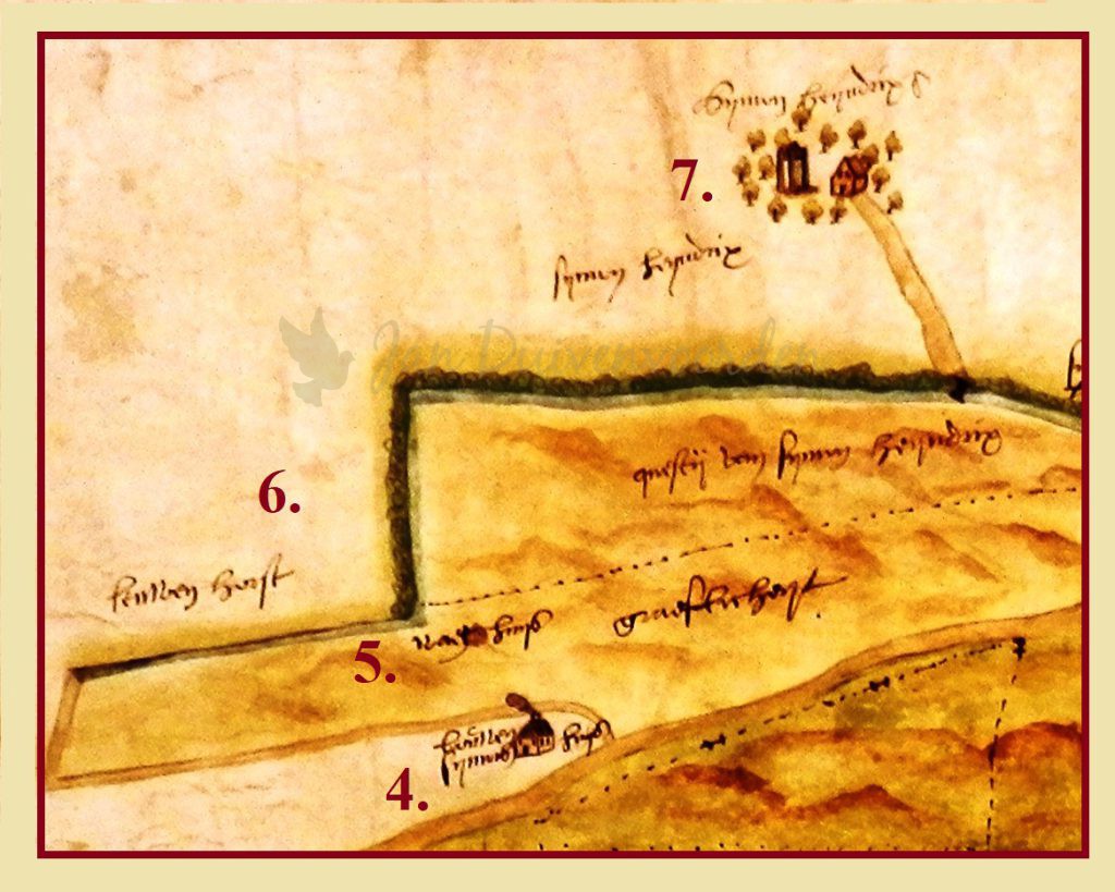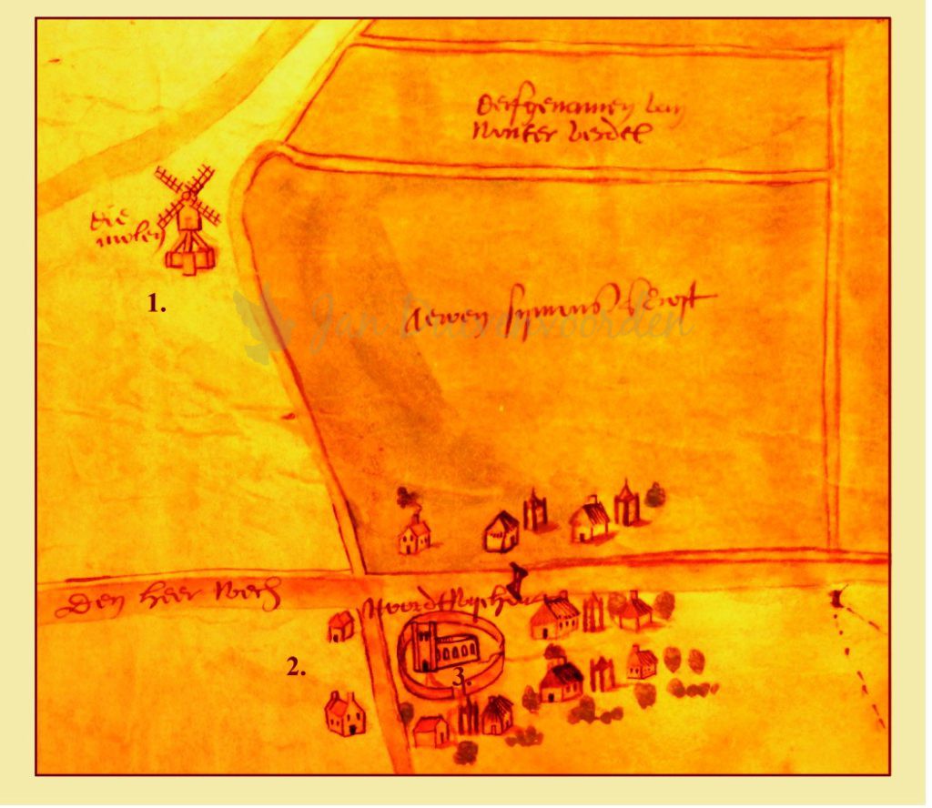 3. De dorpskerk. Hoewel slechts een primitief kerkje is weergegeven ligt interessante informatie ook hier voor het oprapen: de kerk heeft namelijk geen dak meer, zowel toren als kerkschip zijn dakloos, gevolg van de brand in 1573. We weten dat de toren eind 16e eeuw een nieuw dak heeft gekregen en een luidklok, maar van het kerkschip was niet helemaal duidelijk of de grote restauratie uit 1618 ook nodig was om het schip van een dak te voorzien. Deze kaart is daarom van groot belang omdat het bevestigt dat zo’n 15 jaar na de brand er nog altijd geen nieuw dak op de kerk was geplaatst en dat het dus onwaarschijnlijk is dat het kerkgebouw dat jaar gebruikt werd.