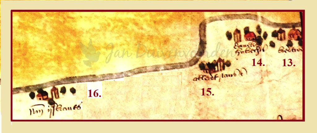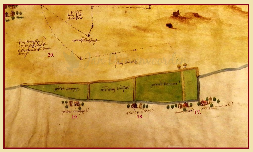 15 en 16. Aleidt Jansdochter en Wm=Willem IJsbrantszoon. De twee voorgaande boerderijen zijn wat locatie betreft goed te herkennen, maar dit detail van de kaart van Sijmon Aerntszoon geeft een smal stuk voor de Herenweg weer, waar die in realiteit veel breder was. En het verdwijnen van boerderijen in dit gedeelte van de Herenweg in de 17e eeuw maakt het extra lastig om de precieze locatie van de boerderij van Aleidt Jansdochter te bepalen. Waarschijnlijk gaat het om de hofstede die later bekend werd als “De Vier Schoorsteenen” en eind 18e eeuw plaats moest maken voor de buitenplaats Duin en Dal. De boerderij van Aleidt wordt hier samen behandeld met die van Willem IJsbrantszoon. We kunnen namelijk aantonen dat beide boerderijen eigendom waren van Leidenaar Jan Vrancken van Alkemade. Aleidt was de dochter van Jan Vrancken, zij trouwde Meester Jan Duijck, wiens naam op het volgende detailkaartje weergegeven is bij een perceel weiland.